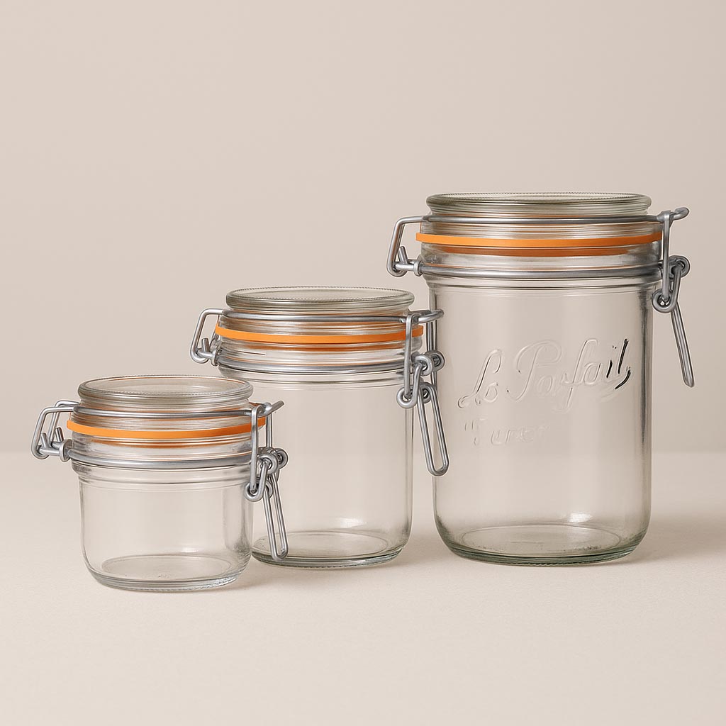 Řada "Super Terrine" od Le Parfait představuje autentické francouzské řemeslo a nabízí vysoce kvalitní řešení pro konzervaci a prezentaci potravin. Tento klasický skleněný pohár se závěsným drátěným uzávěrem a reliéfem "Le Parfait Super" byl speciálně navržen jako sklenice pro snadné vyklopení dortů, koláčků a dalších dezertů. Je také ideální pro marmelády, masné a uzeninové konzervy a širokou škálu jemných pomazánek. S kapacitou od 125 do 1000 ml nabízí "Super Terrine" všestranné využití. Dodávané skleněné víčko a charakteristická oranžová gumová těsnění zajišťují bezpečné, vzduchotěsné uzavření.