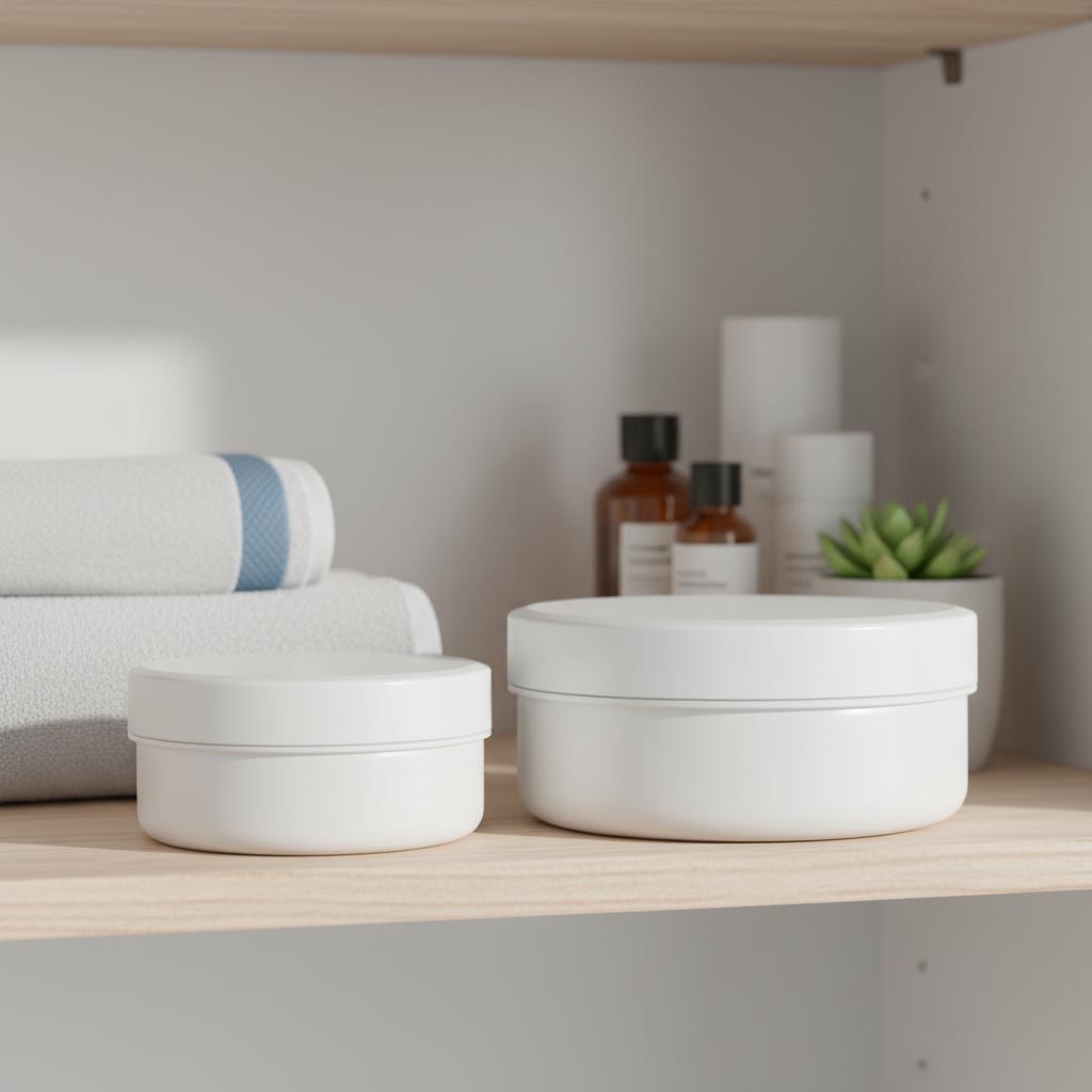 Plastová dóza 'White Line' z produktové řady PP-Tiegel od Flaschenland zaujme svou kvalitní zpracováním a širokým využitím. S objemem 250 ml nabízí optimální řešení pro skladování krémů a kosmetických produktů. Tato kulatá plastová dóza je vyrobena z odolného bílého polypropylenu (PP), který je odolný vůči chladu, vhodný do myčky nádobí a odolný proti UV záření. Praktické šroubovací víčko zajišťuje bezpečné a vzduchotěsné uzavření, čímž je obsah spolehlivě chráněn. Kombinace těchto vlastností činí dózu zvláště trvanlivou a odolnou vůči vlivům prostředí. Plastová dóza 'White Line' o objemu 250 ml je ideální pro uchovávání a přepravu krémů, lotionů a dalších kosmetických produktů.