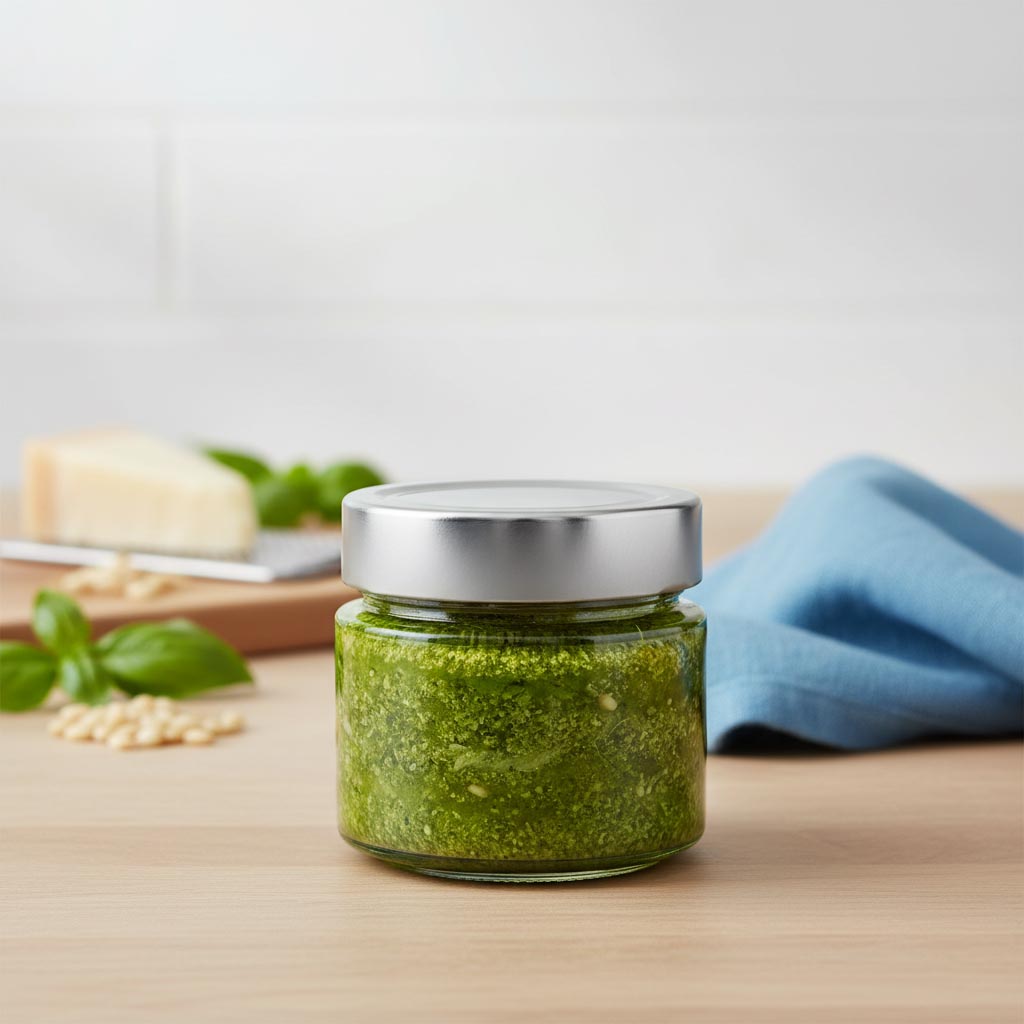 212 ml extra těžkých značkových sklenic s tmavě stříbrným uzavřením šperků. Extrémně elegantní vzhled skla dává jemné omáčky, pasty, pesto, džemy, med, nejlepší možné balení.